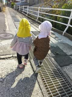 2人仲良く手をつなぐと、こっちに行きたいと指さし