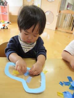 どうしたらテープに触れずに貼ることができるか考える姿もありました