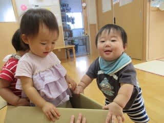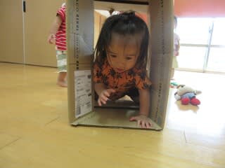 一つの段ボールを使って遊んでいるうちに、段ボールがぺちゃんこになったり、四角に戻ったり・・・