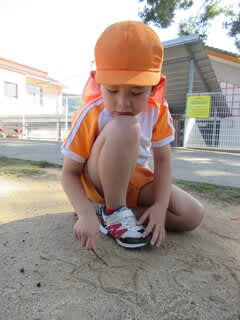 外に出ると砂の上にお絵描き。石や小枝が筆記用具となります(^^♪