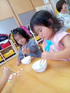 フォークやスプーンを使うのが上手になってきた2歳児さん。