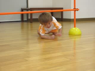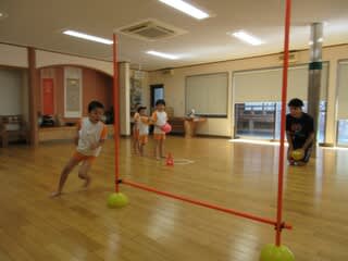 走りながらバーをくぐったり、ジャンプしたりしたりしながら、ボールと触れ合っていきます!