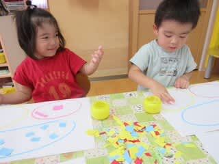 クレヨンで描いた3色の丸の中へ色別に貼っていきます♪