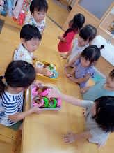 普段から、お買い物へ行った時の様子をよく見ている子どもたちが、見よう見まねで展開する会話にほっこりとなった時間でした♫