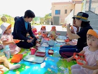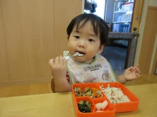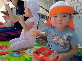2歳児は園庭で、わくわくお弁当を頂きました!(^^)!