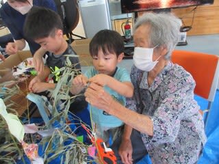 4日(金)に、4・5歳児は、隣接するデイサービス宮を訪問し、利用者の方々と一緒に七夕の飾りつけをしました。