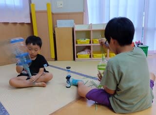 砂時計でタイムをはかりながらペットボトルの中の割りばしを出したり、入れたり・・・