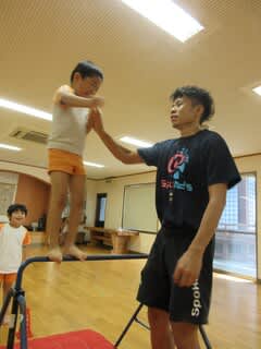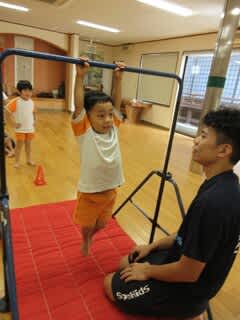 前回りや逆上がりに取り組むだけではなく、いろんな動作を通して、鉄棒に親しんでいきます。