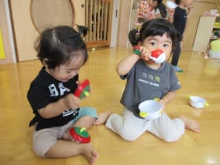 子どもたちは、完成したジュースを飲む真似をして喜んでいました(^▽^)/