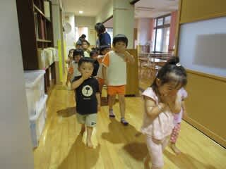 どのようにして避難するのかを良く聞き、しっかりと口元を手で覆い速やかに避難。