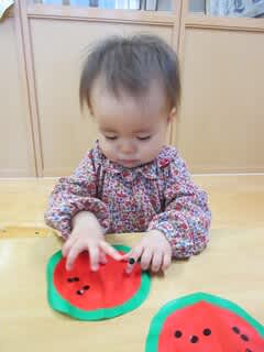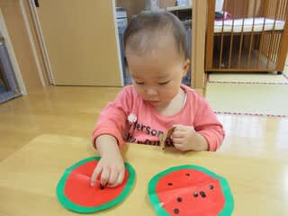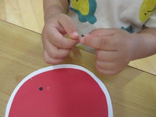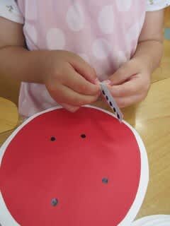 すいかを製作していますが小さな丸シールに挑戦中!