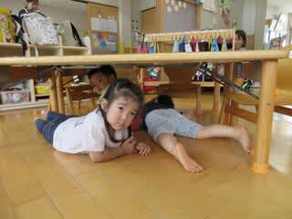 みんな頭や体を守るために、机やオルガン、椅子の下に隠れて揺れが落ち着くのを待ちます。