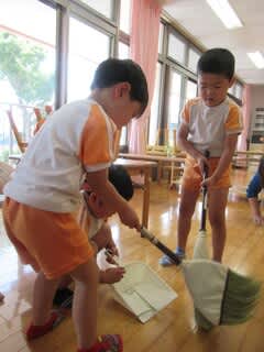 雑巾の他にほうきやちりとりを使って取り組んでいます。