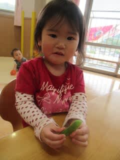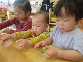 春の旬の野菜・・・スナップエンドウが園に届いたので早速子どもたちと