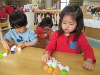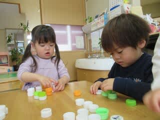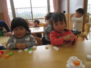 ペットボトルの蓋を持って来ると、「これなーに?」と近寄ってきた子どもたち