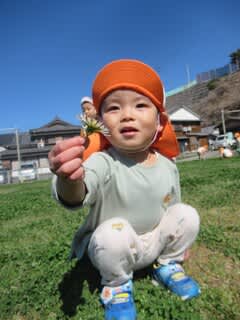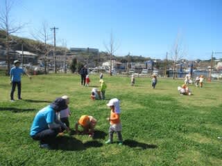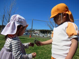 シロツメ草やタンポポを見つけては、「見てみて~」と子どもたち。