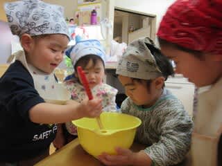 1・2歳児は力を合わせて、材料を混ぜ合わせます!