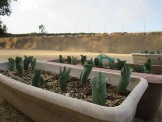 園庭にある、プランターのチューリップもポカポカ陽気に誘われて芽が出てきました。
