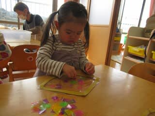 今回は、カラーポリ袋を切ったものをペタペタっ♪