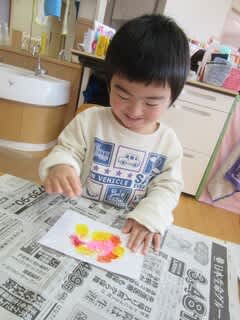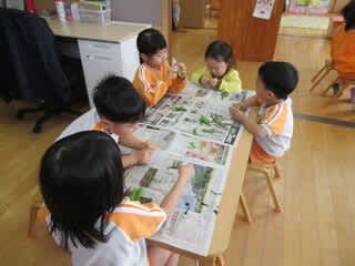 ピンクの他にも、白や黄色、枝は茶色や緑!と確認し保育室に戻ると、早速絵の具を使って製作(^^♪