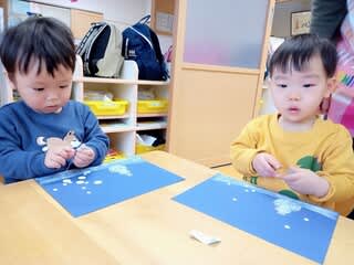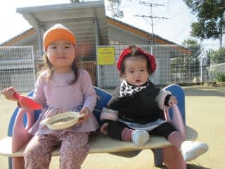 こちらも0歳児さんと1歳児さんが何やら楽しそうに遊んでいました