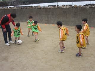 シュートやドリブルを練習した後は、チームに分かれて勝負です!
