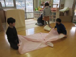 この後、時折小雪が舞う中、園庭へ行って遊びたくて、子どもたちでどうしたら早く遊びに行くことができるか?と