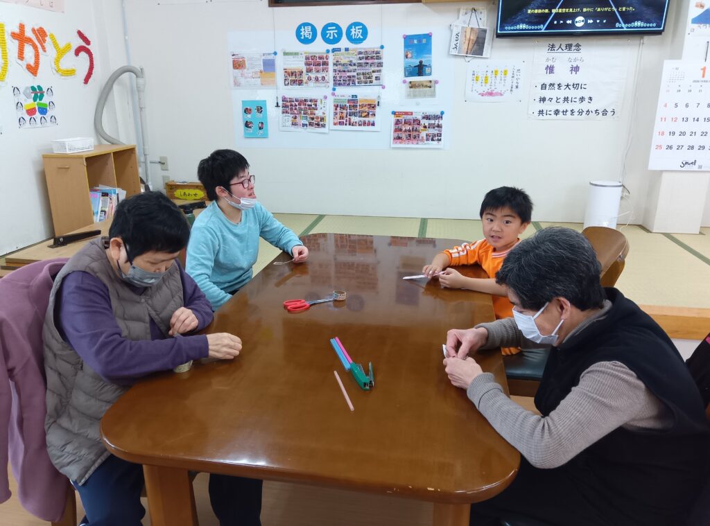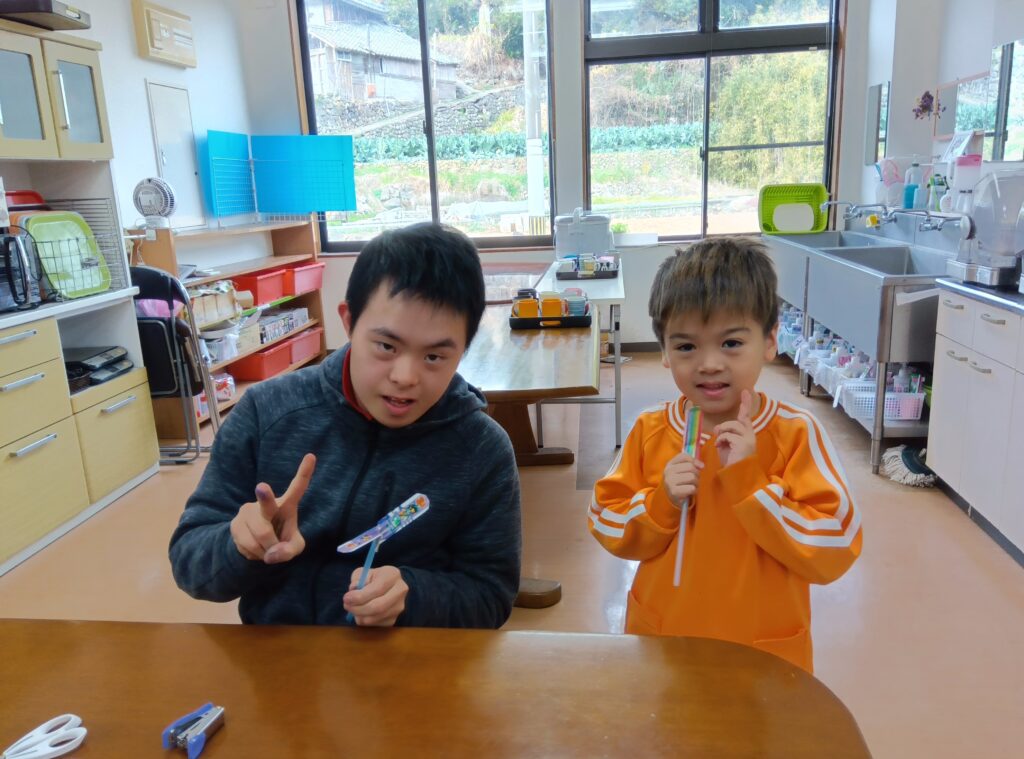 生活介護では一緒に牛乳パックを使用した紙トンボを作成しました!