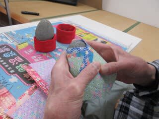 皆さん好きな折り紙を選んで着物のように石に貼り
