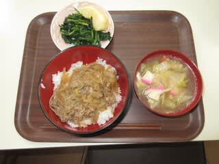 メニューは、「牛丼、けんちん汁、ほうれん草の胡麻和え、フルーツ」