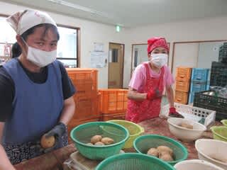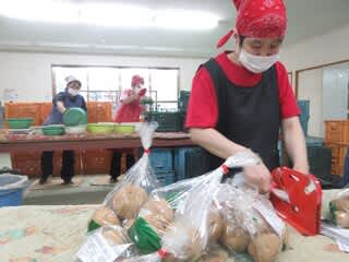 ジャガイモの選別から計量、袋詰め、テープ止めと各担当にわかれて