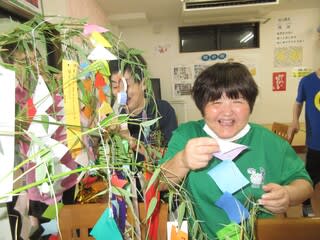 笹飾りは、事業所前にたてみなさんの短冊や飾りが風に乗って流れ