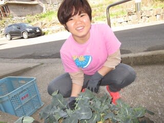 花壇に植えたブロッコリーの収穫・機能維持訓練のための体操をしています