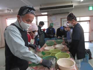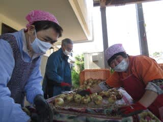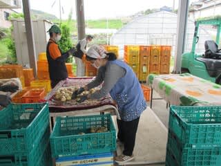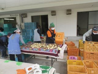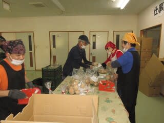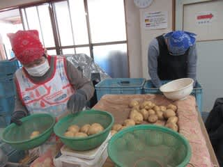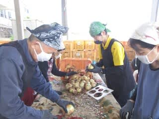 みなさんで協力して取り組み、室内ではジャガイモの袋詰めをしています