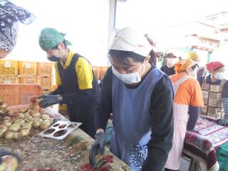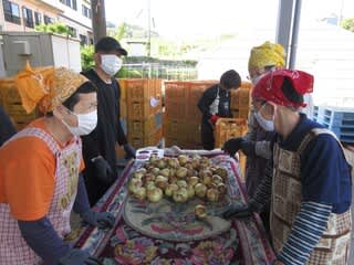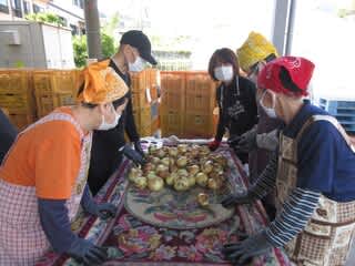 屋外では、タマネギ作業の選別・コンテナ入れを