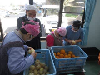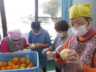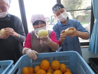 甘夏作業は、皮が固く「指が痛い」とみなさんで言いながらも