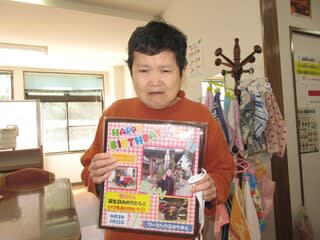 手つくり写真たてと紹介をして、音楽に合わせて誕生日の歌を歌い