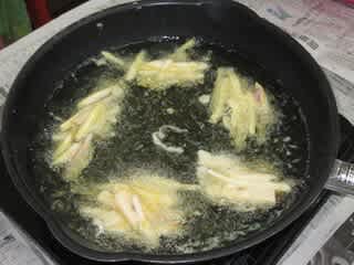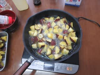 季節に合わせて、旬のサツマイモを使い油で揚げた後は砂糖を絡め・・・