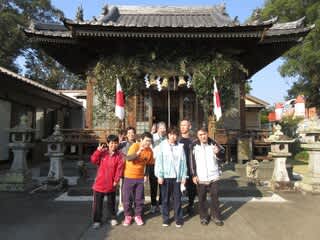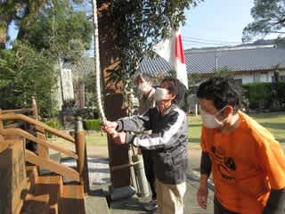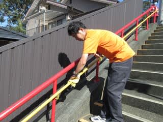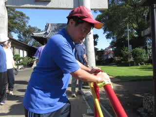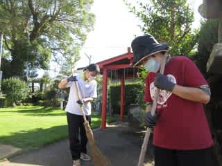 神社周辺の落ち葉をはわいたり、階段の手すりを拭いたり