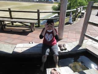 外の気温が暑かったので、冷たい川の水に足を入れて