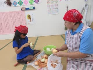 日中一時を利用している児童も玉ねぎの皮むきをお手伝いです