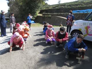 堤防道路では春を感じつつ、菜の花に囲まれて記念撮影も行いました
