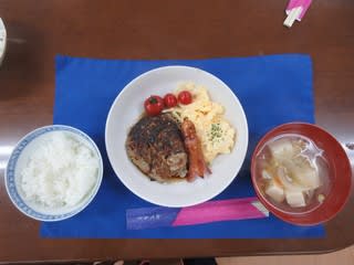本日の手作り昼食は「豆腐ハンバーグ、玉子サラダ、玉ねぎスープ」です。