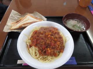 メニューは「スパゲティミートソース、コンソメスープ、ホットサンド」です。