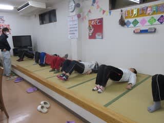 そして仕上げは畳に移動し、お尻を上げて腹筋を鍛え。