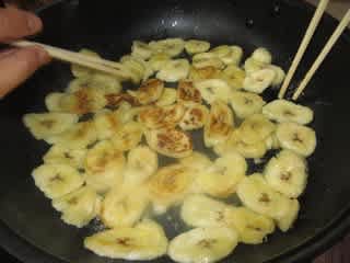 バナナを薄くスライスし、バターを溶かしたフライパンへIN