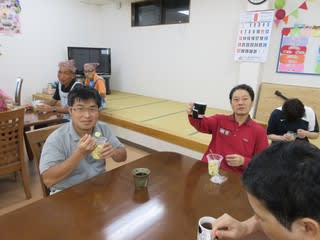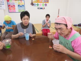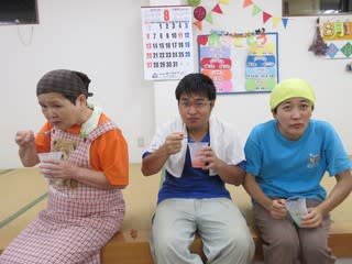 利用者の皆さん仲良く並んでかき氷で夢中でほおばり…いい夏の思い出にもなりました~。