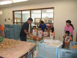 ジャガイモの袋詰め作業にも興味津々の様子、先生の話をしっかり聞いてます