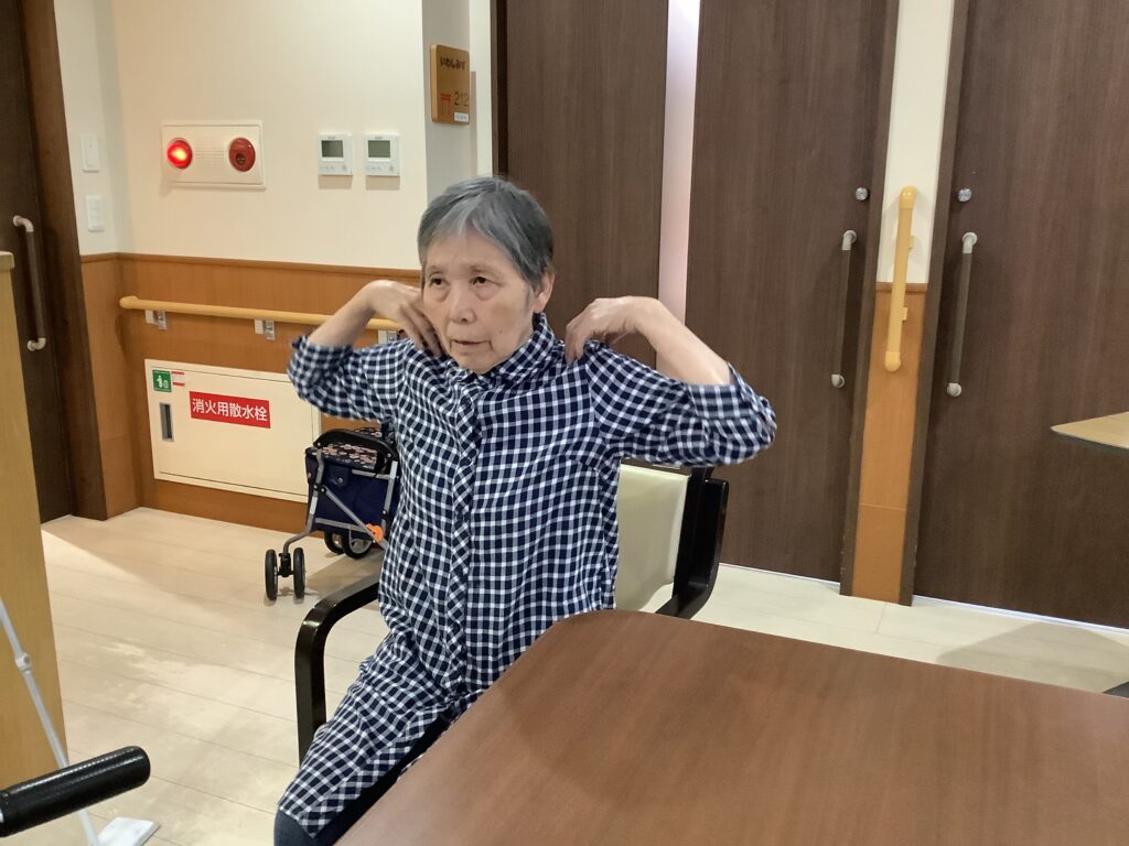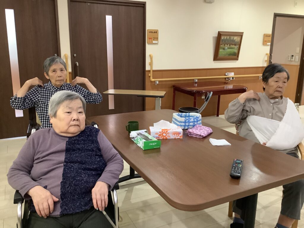 職員さんの口の動きに合わせて入居者さんも『あ~、い~、う~、べ~』と楽しく口腔体操をされています。