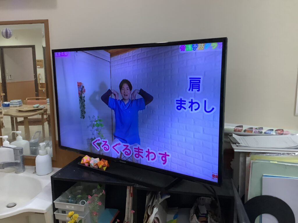 今日は、みんなで健康体操をしました。モニターを視聴しながら